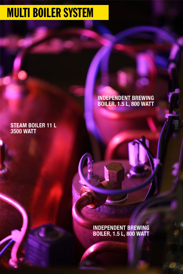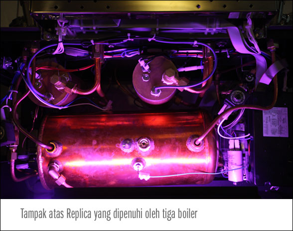 Model yang datang ke rumah saya telah dimodifikasi casing-nya dengan menggunakan panel transparan karena akan dipamerkan di Food & Hotel Indonesia 6-9 April mendatang. Bentuk aslinya menggunakan baja stainless yang mengkilat. Saat tutup atasnya di buka pemandangan yang langsung terlihat ada tiga boiler yang memenuhi ruang mesin. Boiler terbesar berkapasitas 11 liter yang didukung dua boiler di masing2 group head dengan volume 1.5 liter. Di bagian bawah terdapat pompa jenis rotary, sebuah standard yang selalu terdapat pada mesin kelas komersial.