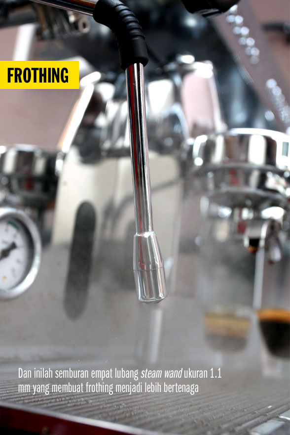 Pada bagian kiri dan kanan terdapat steam wand yang dilengkapi dengan empat lubang berukuran 1.1. mm, sedangkan hot water etrdapat pada bagian kanan yang voume keluaran airnya bisa diatur (volumetric).