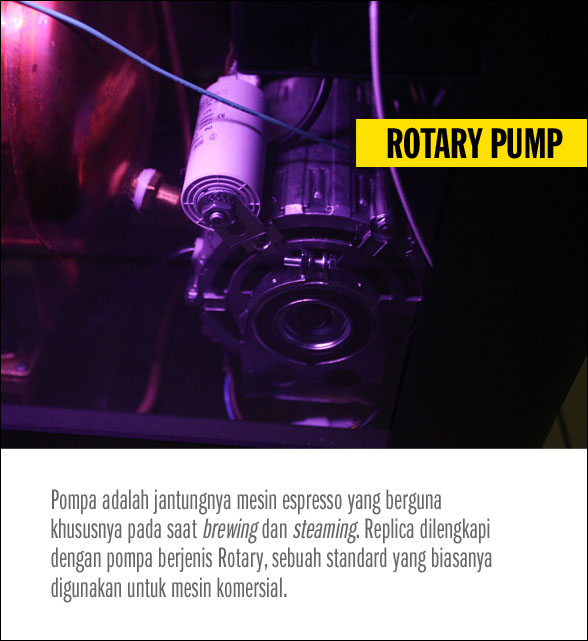 Sebelum perusahaan Toffin mendatangkan Replica, saya sudah pernah membuat sedikit ulasan tentang mesin ini, tapi yang bertipe satu group dengan sistem lever di sini. Walau hanya terdiri dari satu group head, mesin Replica mempunyai berat 50 kg, karena disesaki oleh boilernya yang berukuran 5 liter. Inilah mesin single group dengan kapasitas terbesar yang pernah saya coba dari sisi volumen boilernya.