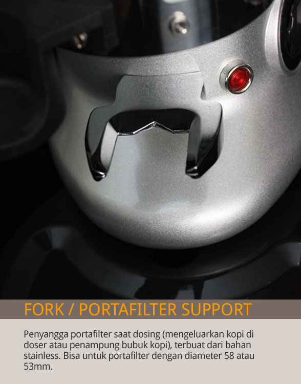 Dosing lever seperti biasa berada di bawah berdekatan dengan indikator lampu dan tombol power on-off. Grinder HC-600 menyediakan tamper plastik yang terpasang pada doser yang saya percaya akan jarang dipergunakan, jadi sebaiknya dilepas saja. Portafilter support terbuat dari stainless steel yang mengkilat dan cukup kokoh kalau Barista ingin meratakan kopinya dengan mengetuk-ngetuk portafilter-nya.
