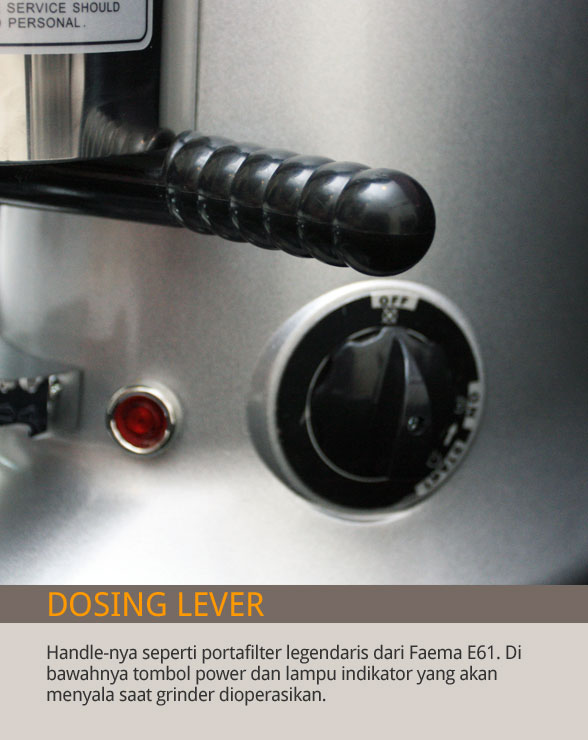 Doser dapat menampung 250 gr bubuk kopi dengan fasilitas finger guard, dan dilengkapi dengan dua batang “sweeper stick”, semacam besi kecil dengan posisi vertikal di pinggir doser untuk menyapu sisa kopi yang tertinggal akibat energi statik.