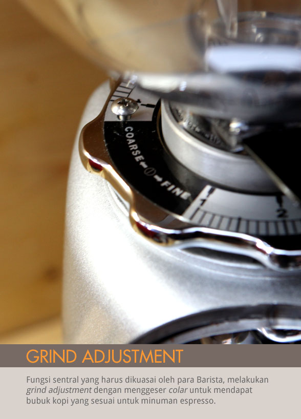 Bagaimana pengaturan halus kasar atau adjustment ? Sebenarnya tidak sulit, mungkin karena grinder ini masih baru maka perlu sedikit usaha untuk menggeser colar ke setting yang lebih halus atau ke arah kanan.