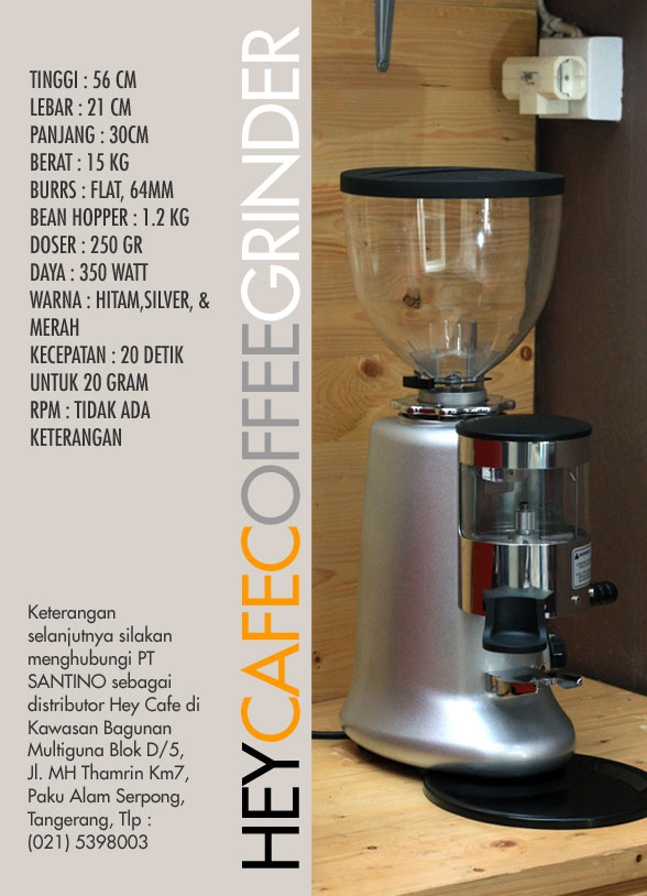 Dijual seharga 7 jutaan, inilah Hey Cafe, kuda hitam espresso grinder yang akan meramaikan pasar alat penggiling kopi di Indonesia. Pertama kali mengenal grinder ini di Singapura yang dipamerkan di salah satu booth pada event Food & Hotel dan mendengar penjelasan penjaga stand-nya yang menyatakan kalau pembuatnya berasal dari Israel yang membuka bisnis di Shanghai, Cina. Di pasarkan di Indonesia oleh PT Santino sebagai salah satu pilihan grinder kelas komersial yang di re-branding menjadi Laranzato untuk pasar di Amerika.