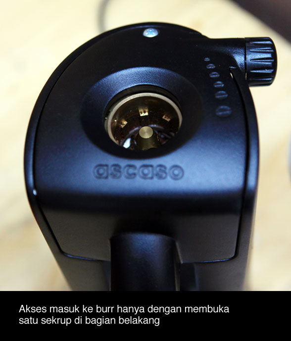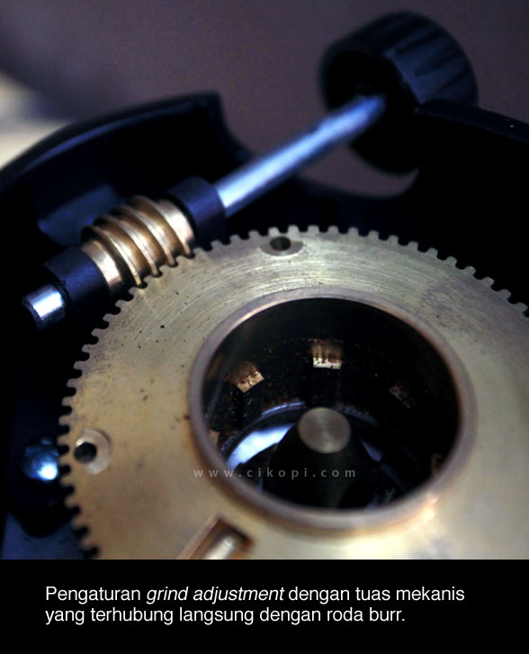 Pengaturan halus-kasar menggunakan knob putar, untuk halus cukup diputar searah jarum jam dan demikian pula sebaliknya untuk mengasarkan hasil gilingan kopi. Di dalamnya terdapat burr atau penggiling yang berbentuk lingkaran berdiameter 54mm terbuat dari baja. Pintu masuk ke dalam burr hanya memutar satu sekrup dan kita sudah bisa langsung mengaksesnya yang akan mempermudah proses pembersihan.