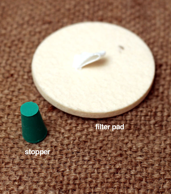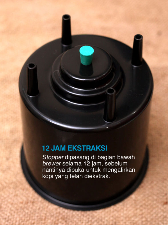 Alatnya terdiri dari sebuah kontainer plastik untuk brewing yang berkapasitas 1.5 liter dan beberapa aksesoris pelengkap seperti pada foto di atas antara lain filter kertas, decanter, filter pad, stopper (foto bawah). Sebenarnya kopi tidak di brew, tapi direndam (soak) yang akan berlangsung selama 12 jam.