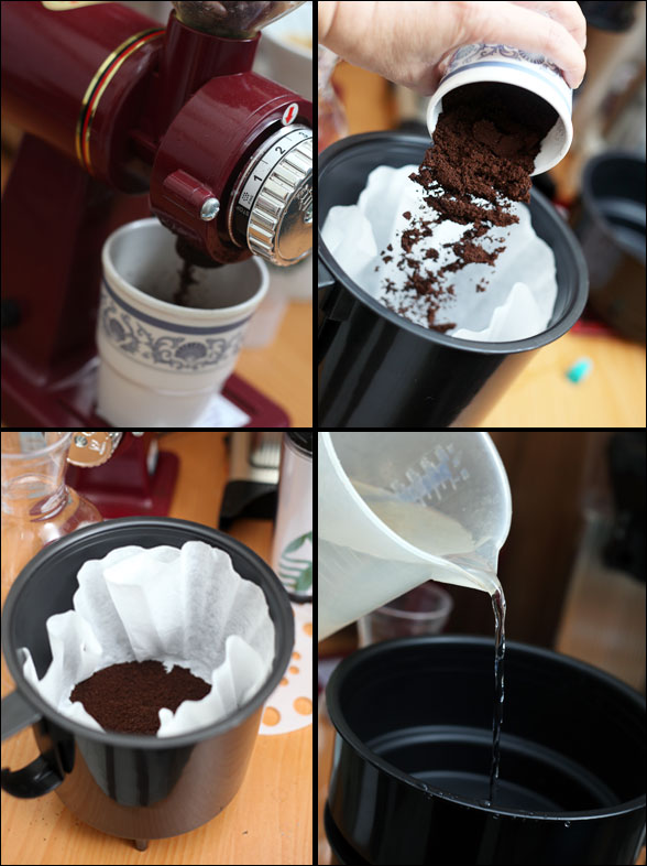 - Masukan kopi yang telah digiling sesusai dengan takaran, misalnya 500 gram untuk 1.5 liter air. Saya mengurangi jumlah kopi hanya 200 gram dengan air sejumlah 600ml.