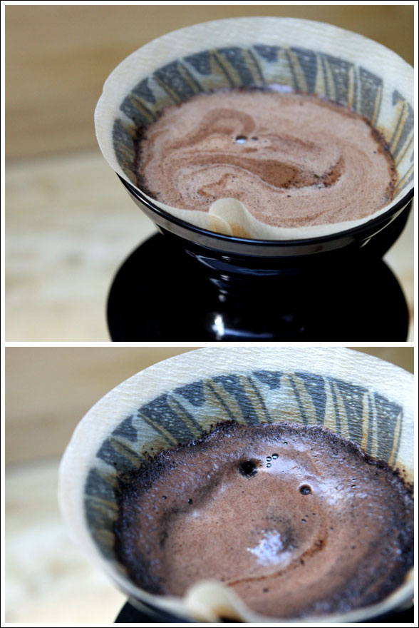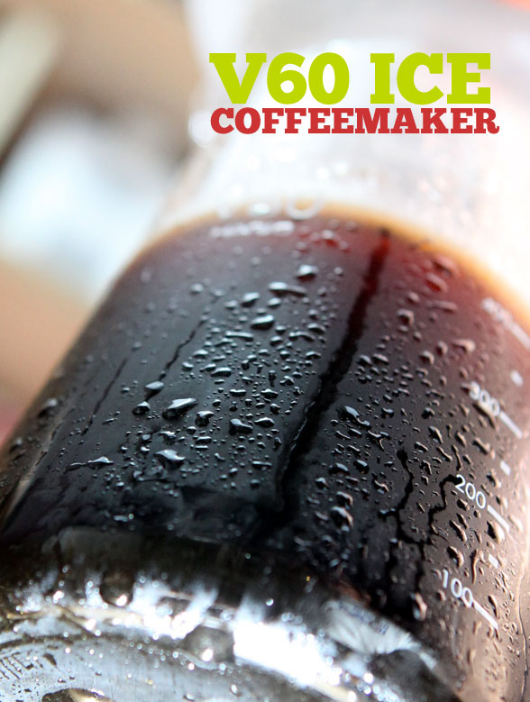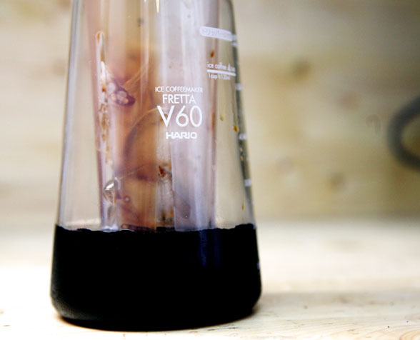 Bagi Anda yang belum membaca cara menggunakan V60 dari Hario, silakan melihat kembali posting saya terdahulu di sini, sini, beserta penjelasan lengkapnya. Prosedurnya hampir sama, dengan menggunakan air yang bersuhu sekita 95 derajat celsius, lalu mulai melakukan pre wet selama 30 detik. Dilanjutkan menuang air dalam gerakan memutar dari titik pusat ke bagian luar, sedikit demi sedikit tanpa terlalu “membanjiri” kopinya. Air kopi kemudian mengalir ke bagian funnel, tempat es batu berada dan tentu saja menurunkan temperatur secara drastis. Semakin banyak kopi mengalir ke bawah, carafe mulai mengembun karena es mendinginkan kopi.