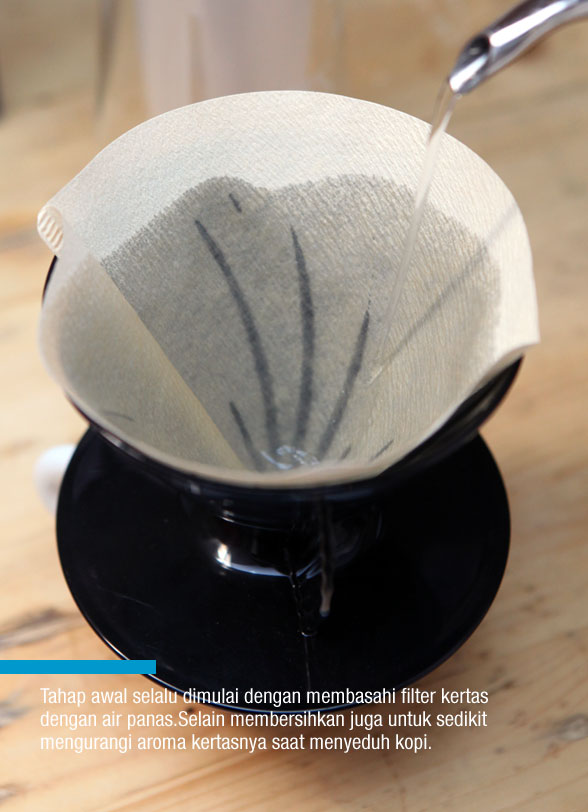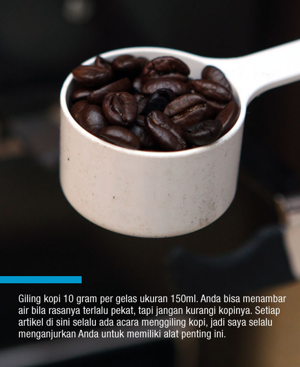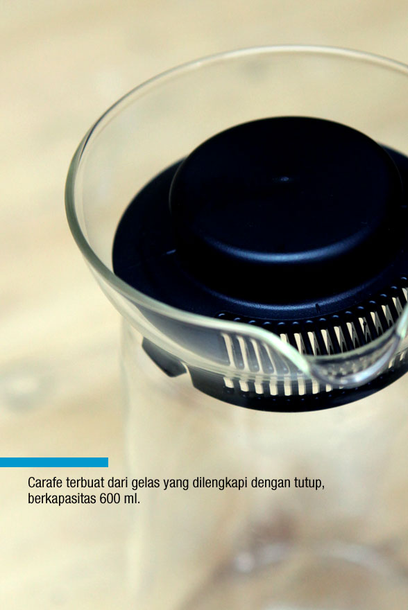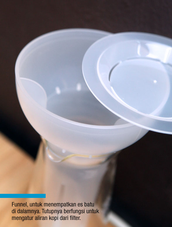 Saya memulainya dengan membasahi filter kertas yang harus Anda beli terpisah karena tidak disertakan dalam kardusnya. Lalu mulai menentukan grind setting yang dipilih lebih halus dibanding untuk french press dan tuang ke dalam filter. Masukan es ke dalam funnel hingga ke bagian atas, lalu pasang tutupnya dan letakan drip filter untuk memulai upacara sakral, brewing.
