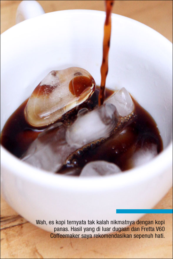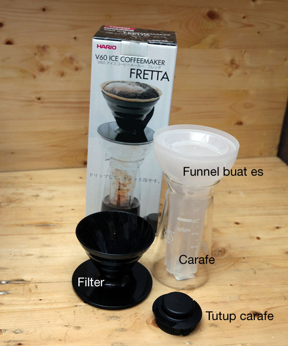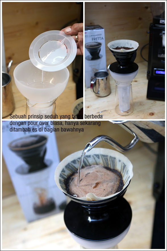 Kalau Anda menganggap kopi ditambah es merupakan bid’ah atau sesuatu hal yang harus dijauhi, mungkin harus mencoba dulu Fretta V60 Ice Coffeemaker buatan Hario. Pada dasarnya merupakan sistem pour over biasa, namun dilengkapi dengan sebuah funnel yang berfungsi untuk menempatkan es batu yang akan dialiri oleh kopi. Mari kita mencoba Fretta.