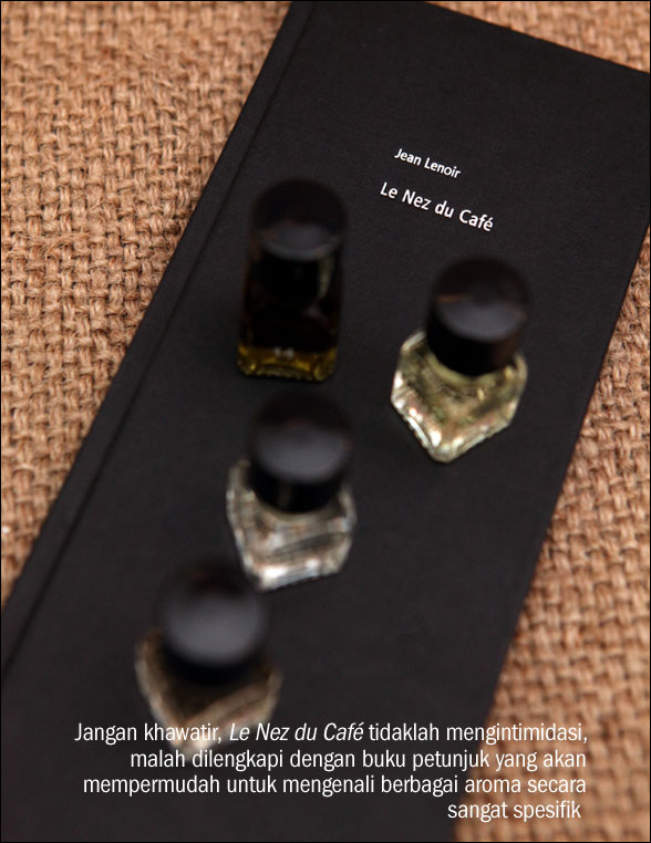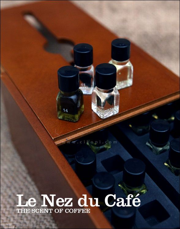 Resianri Triane (26) salah satu staff di Specialty Coffee Association (SCAI) membawakan sebuah kotak ajaib, Le Nez Du Café, yang berisi 36 aroma kopi hasil karya dari ahli penciuman di dunia, Jean Lenoir, pria berkebangsaan Prancis. Lenoir tidak hanya menciptakan aroma kopi, tapi juga berbagai aroma minuman anggur yang salah satu kit-nya berisi 54 aroma yang ditujukan bagi para sommelier dan para pelaku industri di bidang ini. Kit Le Nez Du Café, yang anda lihat akan memandu kita ke dunia aroma yang begitu kaya dan ternyata bukan sesuatu hal yang sulit dipelajari. Resi memberikan pelatihan singkat kepada saya tentang cara menggunakan alat ini.