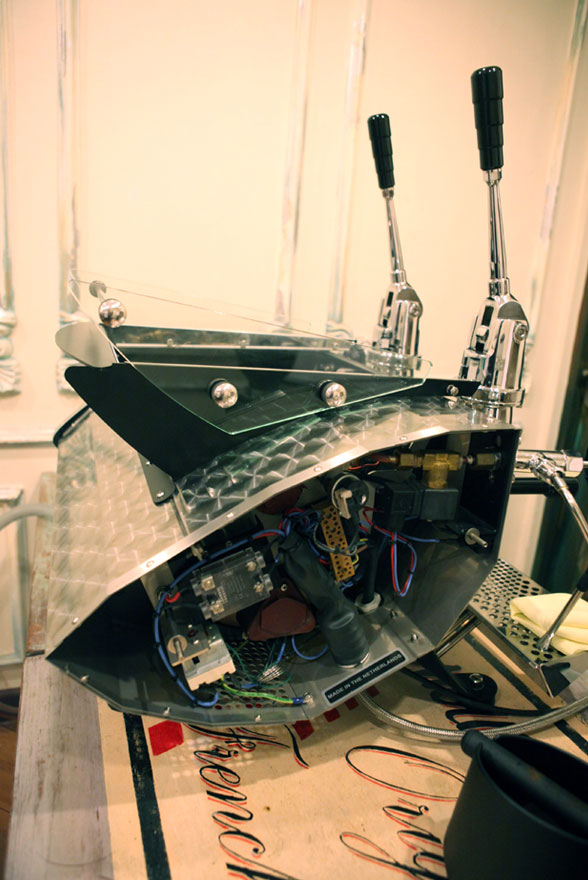 Mesin ini terdiri dari dua group head, dua steam wand, dan satu untuk air panas. Kapasitas boilernya 14 liter, lebih dari cukup untuk frekuensi penggunaan tinggi. Dibalut dengat stainless tebal dan memerlukan tenaga empat orang untuk mendudukannya di atas meja. Karena manual, tidak ada satupun panel elektronik di bagian depan. Satu-satunya alat ukur adalah sebuah manometer yang memuat tekanan boiler dan pompa.