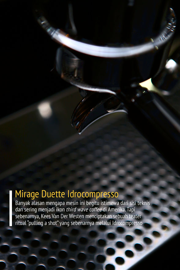 Perlu waktu hampir setahun bila kita berniat membeli mesin dari Kess van Der Westen, merek dan nama insinyur yang berada dibalik Linea, mesin legendaris dari La Marzocco. Pembeli bisa memilih berbagai opsi atau spesifikasi yang ditawarkan termasuk aksesoris, layaknya kita membeli mobil super mewah. Dengan deposit yang sudah kita transfer, Kees akan merakit mesin idaman sesuai keinginan kita yang akan memakan waktu selama beberapa bulan, mungkin hingga setengah tahun sebelum dikirim ke empunya yang tentunya akan memakan waktu lagi. Dengan sistem ini Kees memastikan bahwa mesin mereka selalu eksklusif dan tentu saja dihargai dengan harga selangit. Tipe yang Anda lihat adalah Mirage Indrocompresso yang menggunakan sistem tuas atau lever.