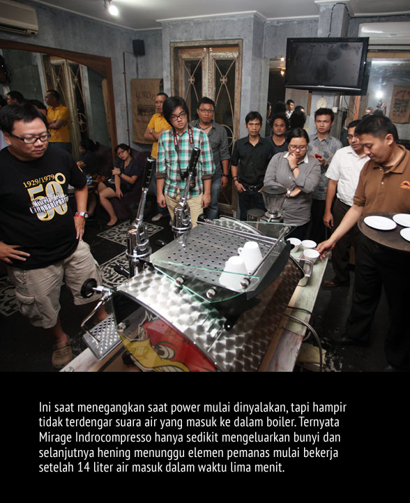 Malam tadi hanya percobaan pertama, kami belum sempat membedah sisi teknis mesin ini, tapi Mirage Indrocompresso tetap anteng saat kemampuannya terus dicoba tanpa henti. Steam wand untuk frothing susu hanya perlu diputar sedikit saja untuk bisa menghasilkan microfoam dalam waktu yang cukup singkat. Masih banyak yang harus dibedah, tapi sayang waktu tidak mengijinkan karena telah beranjak tengah malam. Spesifikasi lengkap tentang mesin ini bisa Anda lihat pada situs mereka di Kees Van Der Westen.