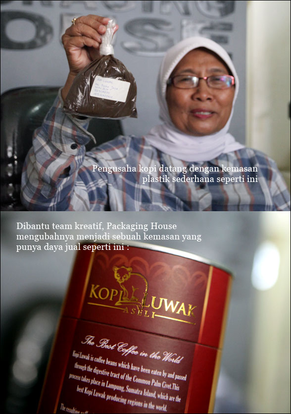 Mengapa kemasan ? Ia menunjukan sebuah produk kopi luwak yang dibungkus dengan plastik dan diberi label yang ditulis tangan. “Apakah orang akan tertairk dengan produk seperti ini ? Saya yakin, sebagus apapun kopi yang mereka jual dalam bungkusan plastik yang bersahaja itu, hanya sedikit, kalau tak seorangpun yang akan melirik kopi tersebut” ujarnya.
