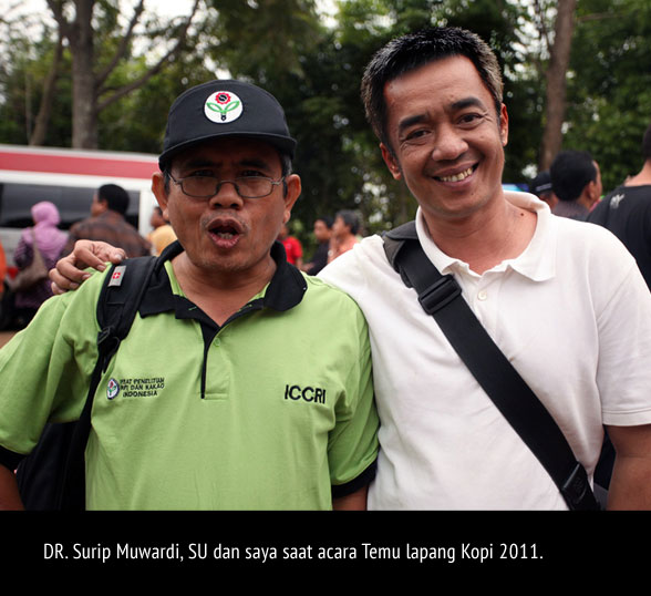 Kalau ada orang yang selalu sibuk melayani sapaan dan pertanyaan dari para undangan termasuk petanikopi selama berlangsungnya acara Temu lapang Kopi 2011 kemarin, DR. Surip Mawardi lah orangnya. Namanya tak pernah berhenti disebutkan dalam setiap acara diskusi saat para petani kopi menyampaikan apresiasinya terhadap peneliti senior Puslit Koka ini. Perjalanan saya ke perkebunan kopi di Toraja yang sudah dirancang jauh-jauh hari sengaja ditunda demi memenuhi undangan mendadak yang disampaikan oleh beliau. Sebuah keputusan yang tentu saja tak pernah disesali untuk bisa berkunjung ke sebuah lembaga sepenting Puslit Koka dan bertemu dengan banyak peneliti kopi dan tentu saja Surip Mawardi (51).