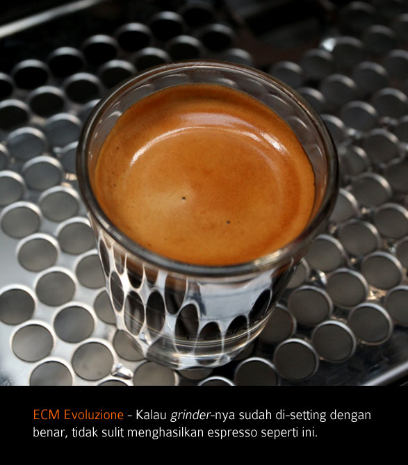 ECM bukan pabrik kemarin sore dalam dunia mesin espresso dan produknya termasuk Evoluzione merupakan salah satu jagoan mereka. Fleksibilitas antara tangki air atau konkesi sumber air lain, penyesuaian tekanan pompa yang berada di luar, drip tray yang juga bisa disesuaikan antara menggunakan sambungan selang atau cukup dengan kapasitas yang ada, merupakan fitur yang diusung oleh ECM. Saya tak enggan untuk merekomendasikan Evoluzione atau tipe Profesional karena alasan durability dan tentu saja performa yang ditawarkan oleh mesin pabrikan ECM ini.
