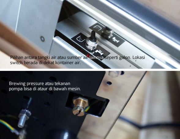 Di atas perbandingan antara model ECM Evoluzione dan Profesional yang sekilas tidak tampak jauh berbeda bukan ? Tapi Evoluzione punya beberapa perbedaan fitur tambahan antara lain : Pertama, pengguna bisa memilih untuk menggunakan tangki air atau langsung disambungkan dengan sumber air. Kedua, kita juga bisa memilih untuk mengalirkan air kotor melalui drip tray dengan menggunakan selang kecil atau cukup memanfaatkan kapasitasnya yang bisa menampur sekitar 700ml air. Ketiga, dan ini yang paling saya sukai adalah penempatan baut (ukuran 12) tepat di bagian bawah kanan mesin untuk mengatur tekanan pompa. Fasilitas ini memudahkan pengguna tanpa harus membuka tutup mesin untuk melakukan penyesuaian tekanan. ECM tidak memberikan panduan berapa tekanan ideal, tapi untuk moderatnya kita bisa mematok di angka 9 bar untuk melakukan brewing.