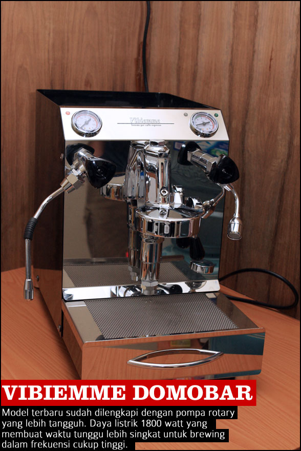 Hello Vibiemme Domobar … sudah lama saya tidak menggunakan mesin ini, tapi kemampuannya tidak udah diragukan lagi. Model terbaru sudah menggunakan pompa rotary walau saya kurang sreg dengan pembuangan pipa air kotornya yang harus sedikit dimodifikasi agar lebih mudah dipasangi selang. Selebihnya Anda tidak akan kecewa dengan mesin yang sudah banyak digunakan di banyak warung kopi. Sama halnya dengan ECM, mesin ini bisa dinyalakan seharian tanpa khawatir akan overheat, kecuali beberapa kali flush agar suhunya kembali siap untuk brewing. Banyak yang sudah menggunakan Vibiemme Domobar antara lain Restoran Lisung di Dago Pakar Bandung, Republik Kopi di Medan.