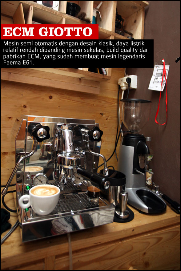 Cobalah ECM Giotto, dan saya yakin Anda akan jatuh hati terhadap kemampuannya yang sangat stabil dengan waktu jeda yang cepat walau daya listriknya hanya 1200 watt. Cukup lama saya menggunakan mesin ini di rumah dan tidak pernah ada keluhan apapun sebagaimana yang diamini oleh rekan Roswell Coffee di Bandung. Satu hal yang paling saya sukai dari mesin ini adalah sistem pembuangan airnya yang begitu rapi tertata sehingga tidak menyisakan genangan sedikitpun.