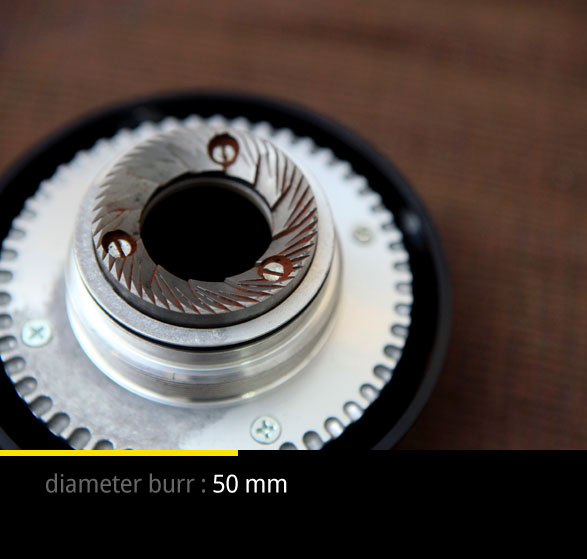 Sama dengan Rancilio Rocky, grinder Grinta menggunakan ukuran burr 50mm, namun dengan material besi dan bukan brass seperti pada Rocky.