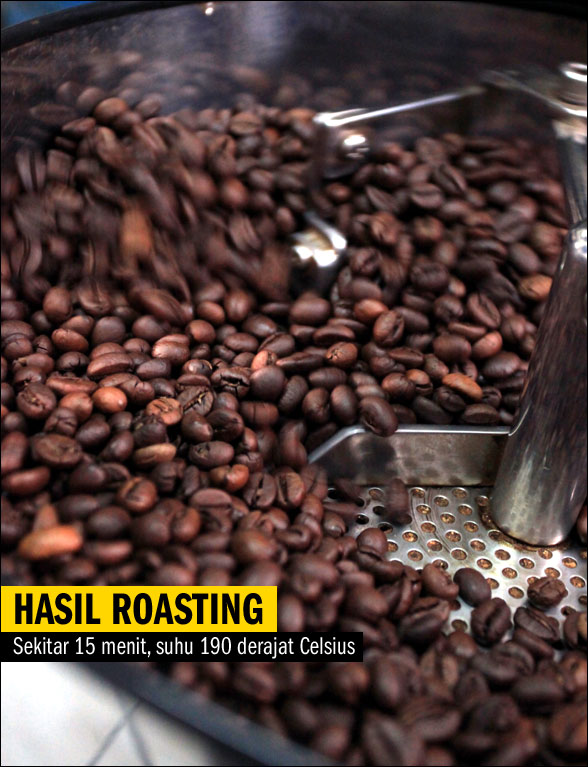 Baiklah, waktu sudah sekian menit dan bunyi letupan kecil sudah terdengar dua kali, dan tanganpun semakin rajin melihat warna biji kopi yang semakin gelap. Ini saat-saat kritis dimana sedikit kelengahan akan mengakibatkan kegagalan proses roasting yang tentu saja tidak bisa diulang. Tapi hal itu bisa dihindari apalagi Kasmito menempatkan satu alarm yang berbunyi lima setelah roasting berlangsung selama 10 menit. Tujuannya sederhana saja katanya, agar roaster berkonsentrasi di saat-saat akhir. Jadilah waktu yang ditentukan sudah habis dan hasilnya pun bisa Anda lihat di foto bawah.