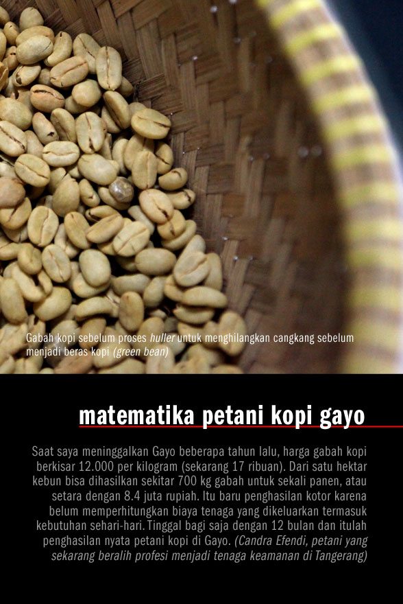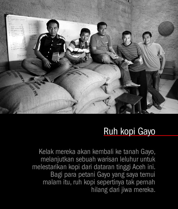 Dua rekannya Candra dan Iwan serta keluarganya yang berada di jakarta mulai kembali tertarik dengan usaha yang dilakukan Win. Kelak mereka akan kembali ke tanah Gayo, melanjutkan sebuah warisan leluhur untuk melestarikan kopi dari dataran tinggi Aceh ini. Bagi para petani Gayo yang saya temui malam itu, ruh kopi sepertinya tak pernah hilang dari jiwa mereka.