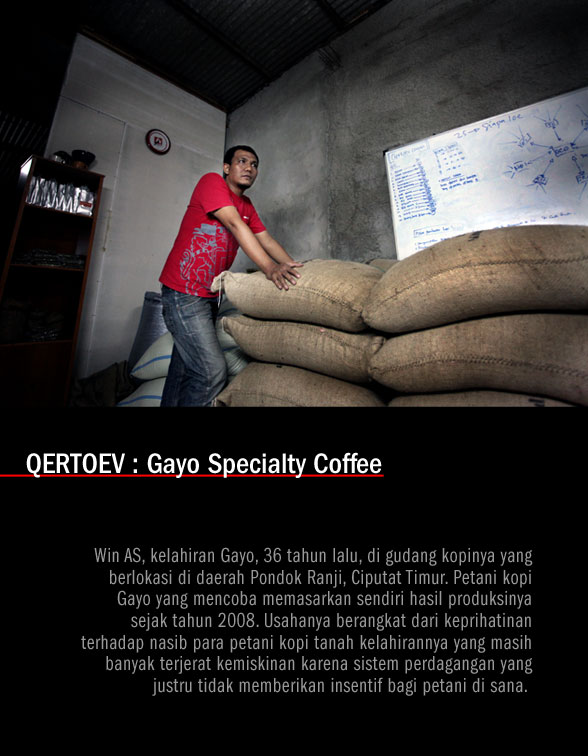 Di sebuah jalanan di pelosok Pondok ranji Ciputat yang minim penerangan saya bertemu dengan Win Hasnawi (36 tahun), petani kopi Gayo.  Saya merupakan penikmat kopi Gayo dan merupakan salah satu alasan kedatangan ke gudang Qertoev, nama dagang kopi Gayo yang ia pasarkan sejak tahun 2008. Baru kali ini saya menemukan seorang petani kopi nun jauh dari Gayo sana memasarkan langsung hasil produksinya di Jakarta. Ia tengah berjuang melanggar sebuah pakem supply chain, memangkas banyak perantara dalam sistem perdagangan kopi dan Qertoev sudah mulai banyak dikenal sebagai salah satu pemasok kopi Gayo khususnya di Jakarta.
