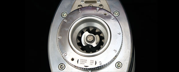Colar Adjustment. Di bawahnya sebuah besi bulat (burr bagian atas) merupakan pengatur kehalusan bubuk kopi yang diberi angka 0-9 untuk memudahkan kita mengingat area yang biasa digunakan. Disertai sebuah tuas kecil untuk membantu menggeser saat melakukan setting. Cuma untuk alat sebesar ini, Mazzer hanya melengkapinya dengan ukuran panjang 7 cm, sangat kurang untuk membantu mendapatkan momentum yang pas saat menggese burr.