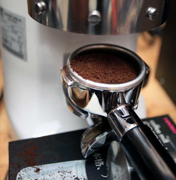 Doser. Dilengkapi dengan alat pelindung jari (finger guard), untuk menghindari Anda yang mungkin iseng memasukan tangan ke dalam bagian yang bergerak ini. Sebuah besi kecil yang diletakan di pinggir doser (sweeper) merupakan alat bantu agar kopi tidak terlalu menempel di sekeliling doser. Pada bagian penting ini, mungkin akibat terburu-buru para Barista dengan penuh semangat melakukan dosing sekuat tenaga dan menjadikan besi pegas pada bagian ini rentan rusak.