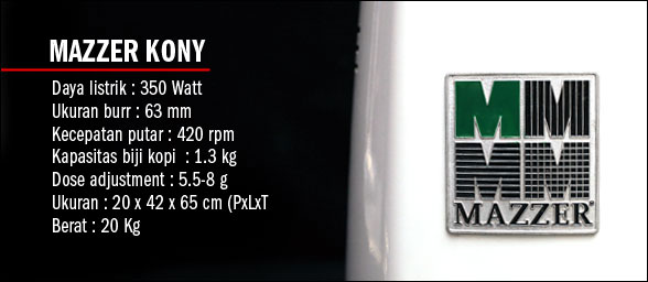 Mazzer Kony. Produk Mazzer yang Anda lihat adalah “Kony” berada di atas tipe Mini dan Super Jolly dengan spesifikasi seperti di atas. Disandingkan dengan mesin espresso Vivaldi II milik saya di rumah, Kony menjulang jauh lebih tinggi dengan balutan cat warna putih dan emblem logo Mazzer di bagian belakangnya.