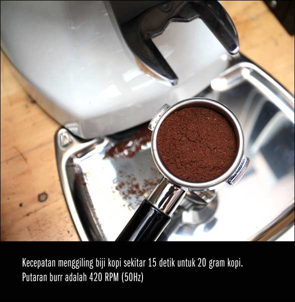 Menggunakan Kony. Teorinya dengan kecepatan putaran burr yang hanya 400an RPM, Kony akan menggiling kopi relatif lebih lambat. Tapi saat digunakan untuk 20 gram kopi hanya diperlukan 15 detik, sangat tidak mengecewakan. Kecepatan yang rendah juga membuat suara Kony lebih perlahan, dibanding dengan semua grinder yang pernah saya coba di rumah.