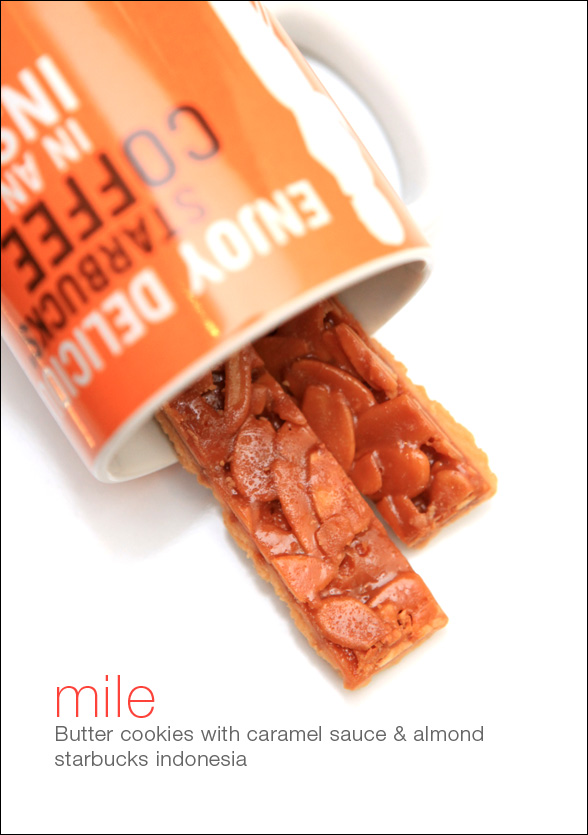 Seperti biasa pada setiap pelucuran produk barunya, Starbucks selalu menyertakan “teman ngopi” berupa empat jenis sweet dan salah satunya Mile, kue kering yang dilapisi saus karamel dan almond yang intinya sinfully delicious! Sebenarnya selain Italian Roast dan Colombia, VIA telah diluncurkan dengan rasa lain seperti Iced Coffee, Caramel, Cinnamon, Spice, dan Mocha, yang sayangnya belum masuk ke Indonesia.