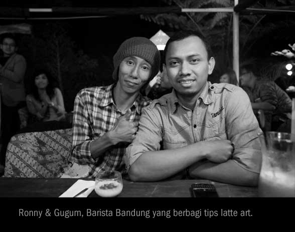 Gugum dan Ronny dua orang barista dari Bandung menjelaskan tahapan frothing dan menuang susu ke dalam cangkir espresso untuk dijadikan sebuah pola yang menarik. Dengan sabar keduanya berbagi tips yang berguna seperti bagaimana kedudukan steam wand (tuas di mesin espresso untuk membuihkan susu) di dalam milk jug, suhu maksimal yang tidak boleh melebih 70 derajat celsius, serta cara menuang susu yang tepat sehingga bisa dibentuk sesuai dengan kreasi masing-masing peserta.