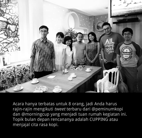 Kopi Javva hanya bisa menampung sedikit peserta untuk acara sejenis ini dan bagi yang berminat untuk hadir pada bulan berikutnya harus terus mengikuti perkembangan dari tweet @peminumkopi, @morningcup dan tentu saja @kopijavva. Bulan berikutnya Kopi Javva akan menyelenggarakan acara Cupping atau menguji cita rasa kopi, sebuah agenda menarik bagi yang ingin tahu cara mencicip kopi dan menemukan berbagai rasa dari secangkir kopi.