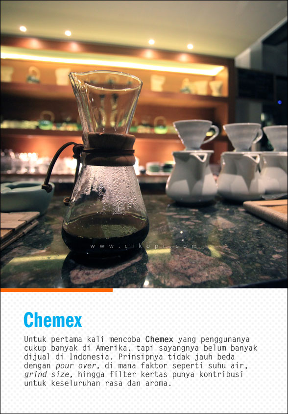 Sambil menunggu Michael Tan yang empunya Ippolito, sebuah cafe di kawasan Seminyak Bali, saya dengan Andreas Hardjito bermain dengan Chemex. Alat brewing ini ternyata cukup njlimet layaknya pour over yang sayangnya belum banyak dijual di Indonesia, tapi kopi Cobra yang berasal dari Brazil tapi ditanam di Kintamani Bali dari Ippolito berhasil diseduh dengan sukses oleh Andreas yang keesokan harinya berhasil menyandang titel Q Grader. IPPOLITO !