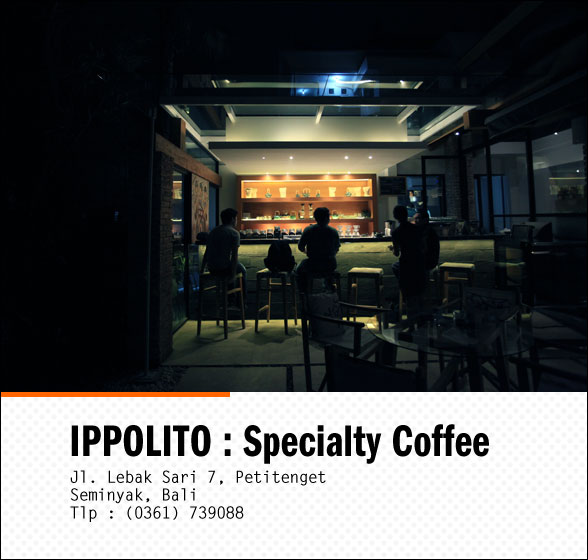 Ippolito tentu sangat saya rekomendasikan bagi Anda yang akan atau sedang melakukan perjalan di pulau Dewata, sebuah cafe yang rasa kopinya punya signature tersendiri berkat keberanian Michael meracik kopi yang rasanya akan terus tertanam dalam ingatan. Ippolito berhasil memperkaya maskulinitas kopi Indonesia yang begitu pekat untuk dipadukan dengan kopi luar seperti dari wilayah Afrika yang kaya dengan rasa floral dan acidity yang khas seperti rasa tamarind (moga2 catatan saya bener 🙂 ) .