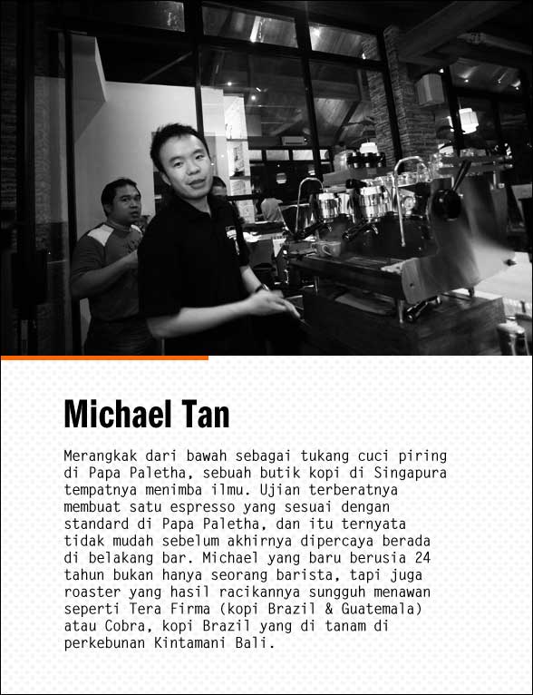 Michael Tan baru berusia 24 tahun, lulusan sekolah bisnis di Kanada, dan atas nama sebuah “takdir” akhirnya nyemplung ke dunia kopi di mana karirnya bermula sebagai tukang cuci di Papa Paleta, butik kopi terkenal di Singapura. Padahal kesempatan kerja sebagai orang kantoran tentu sudah terbuka lebar, tapi Michael akhirnya memilih dunia F&B dan total melakukan yang terbaik untuk Ippolito. Nama ini ia pilih karena kaitan Paus Clement ke VIII yang nama kecilnya Ippolito Aldobrandini yang konon pernah memfatwakan kehalalan kopi yang waktu itu banyak dikonsumsi oleh orang Arab pada abak ke-16.
