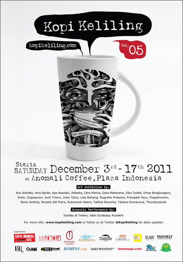 Komunitas seni Kopi Keliling yang kebanyakan merupakan desainer grafis datang lagi dengan berbagai kegiatan yang menggabungkan kopi sebagai salah satu temanya selain musik dan karya-karya grafis. Kalau Anda ingin tahu apa dan bagaimana kegiatan mereka, coba baca artikel saya terdahulu di Kopi Keliling, di mana para punggawanya menggagas bahwa seni milik semua orang dan mengajak khalayak untuk terus mengasah kreativitasnya.