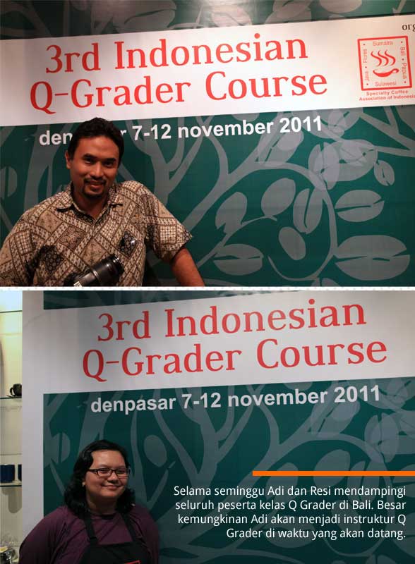 “Siksaan” selama seminggu yang dialami 24 peserta se Indonesia sudah berakhir sore tanggal 12 November di Kopi Bali House, Sanur, Denpasar – Bali, tempat berlangsungnya acara Q Grader Course. Indonesia melahirkan lagi Q Grader terbaru yang berhasil melewati berbagai ujian yang tak ringan untuk akhirnya berhak menempelkan titel terhormat ini. Dari Bali saya mengikuti dengan seksama kegiatan Q Grader hingga acara selesai dan turut menyaksikan bagaimana kelas ini didesain dengan berbagai materi yang membuat kesempatan lolos menjadi seorang Q Grader sungguh bukan hal yang mudah. Belum lagi biaya yang harus dikeluarkan sebesar 9 juta lebih hingga Malik Hasan salah satu peserta dari Aceh terpaksa harus melego motor pribadinya demi mengikuti kursus ini.