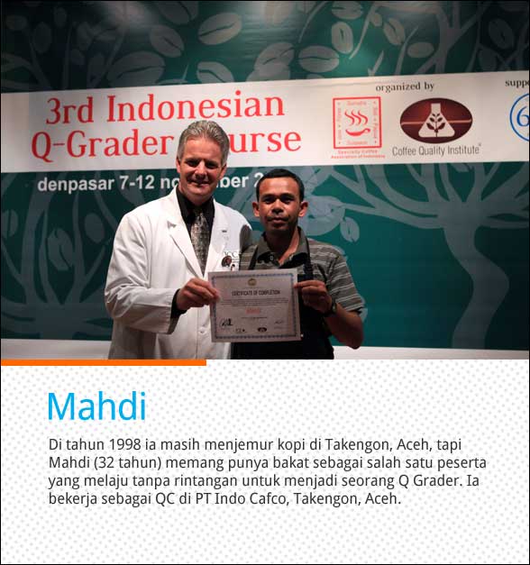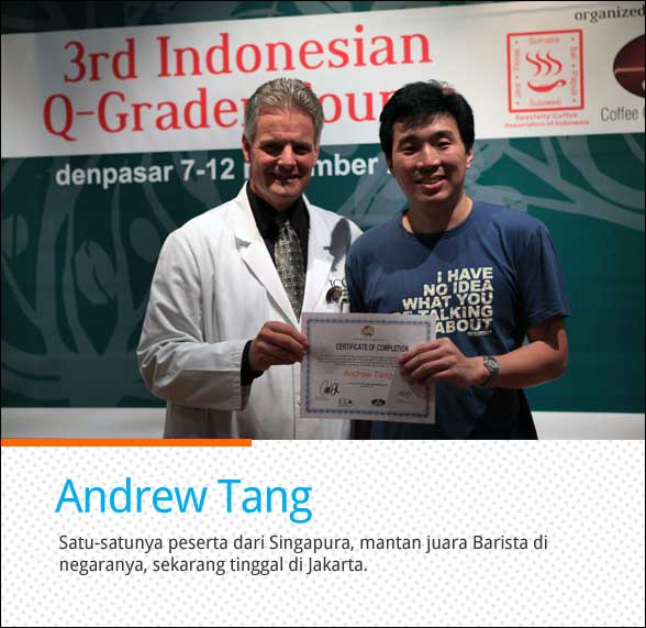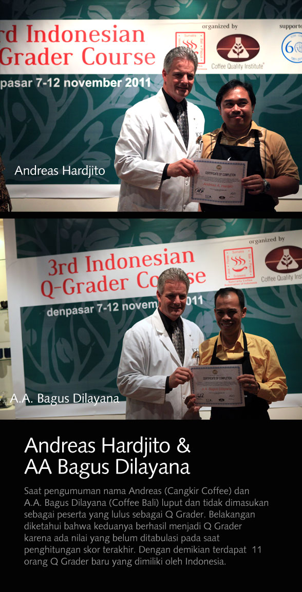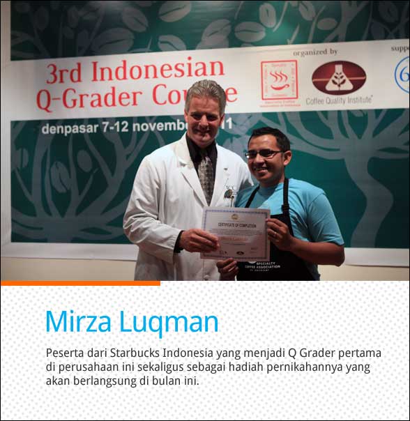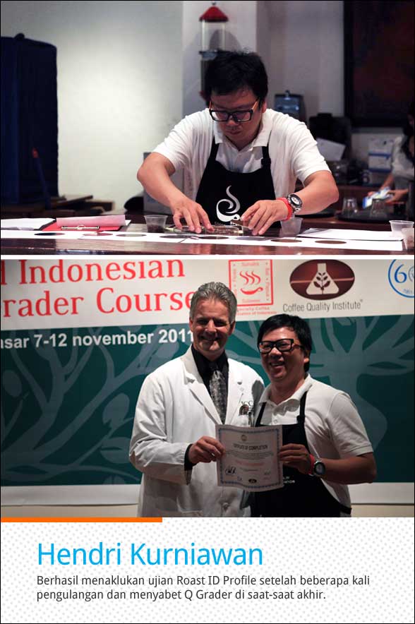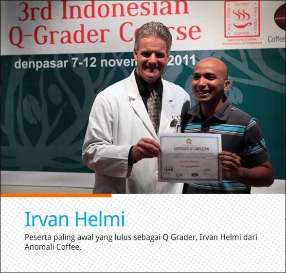 Sebanyak 9 orang yang antara lain : Hendri Kurniawan (espresso1st), Irvan Helmi (Anomali Coffee) , Mirza Luqman (Starbucks), Buntoro Oetomo (PT Bintang Tunggal Sejati, Surabaya), Mahdi (Indo Cafco, Takengon, Aceh), Malik Hasan (National Cooperative Business Association, Takengon, Aceh), Vivi Sofia (Kopi Bali), Andrew Tang (peserta dari Singapura), Eman Wisnu Putra (green bean trader), adalah sebagian peserta yang telah berhasil menyandang Q Grader dari total 24 orang yang mengikuti kursus ini.