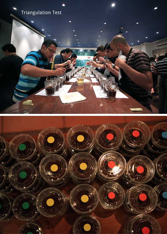 Setelah itu peserta langsung melakukan test Cupping atau uji cita rasa kopi Brazil yang sebelumnya keseluruhan peserta diberikan satu sampel rujukan (reference sample) dengan tujuan untuk patokan penilaian rasa. Lalu disusul dengan Triangulation yaitu mencari nuansa pada 1 kopi yang berbeda dari 3 cangkir kopi dalam satu kelompok dengan total 18 cangkir atau 6 kelompok cangkir kopi. Menurut Rocky Rhodes instruktur dari ICC di sinilah ujian tersulit yang dihadapi oleh keseluruhan peserta dengan 2 hingga 3 kali pengulangan. Acara hari pertama ditutup dengan cupping kopi dari Indonesia.