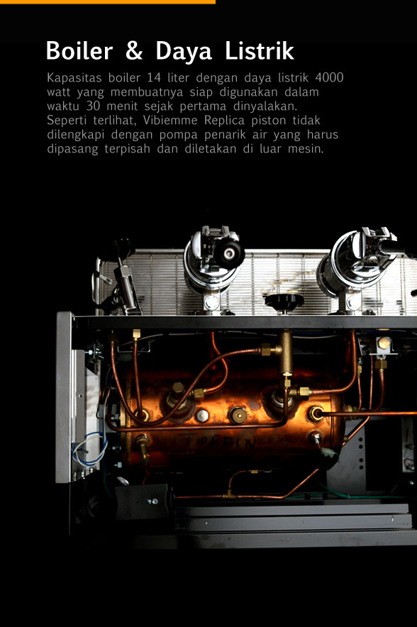 Sayang manual mesin ini menghilang entah kemana, jadi tidak terlalu banyak detail yang akan saya tulis kecuali kapasitas boilernya yang sungguh besar, 14 liter. Belum lagi daya listrik yang akan menghabiskan 4000 watt saat elemen pemanasnya mulai bekerja. Saya tidak tahu apakah satu elemen pemanasnya bisa dicabut untuk mengurangi pasokan listrik walau biasanya berakibat lambatnya boiler memansakan air. Tapi beberapa teknisi mesin banyak memberitahu trik yang sudah lumrah dilakukan tanpa ada pengaruh terhadap kinerja mesin tersebut. Sebagai catatan, mesin sistem lever sebagaimana Replica tidak dilengkapi dengan pompa seperti pada mesin semi atau otomatis dan air harus didorong oleh pompa kecil seperti Flojet.