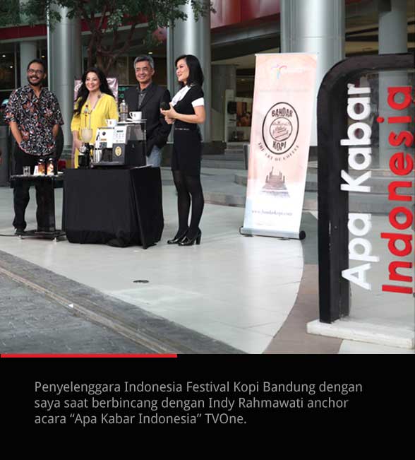 Saya diundang sebagai salah satu nara sumber pada segmen acara “Apa Kabar Indonesia” di TV One Selasa pagi tadi bersama penyelenggara Festival Kopi Bandung yang diwakili oleh Ellyanthy Tambunan dan Hermawan Rianto. Secara singkat pantia menggarisbawahi pentingnya acara yang akan mereka gelar tanggal 23 Desember ini untuk lebih mempromosikan kopi Nusantara kepada khalayak ramai. Saya tentu memberikan dukungan kepada setiap kegiatan yang bersifat edukatif dan membuka wawasan masyarakat luas akan kekayaan kopi Indonesia. Harapan jangka panjangnya konsumsi kopi spesial akan terus meningkat sebagaimana yang dikatakan Hermawan Rianto, Direktur Festival “Jika saja penduduk Indonesia mengkonsumsi kopi 2 hingga 3 kali per hari, maka eksport kopi ke luar negeri bisa sangat berkurang kalau tidak bisa dikatakan dihilangkan”.