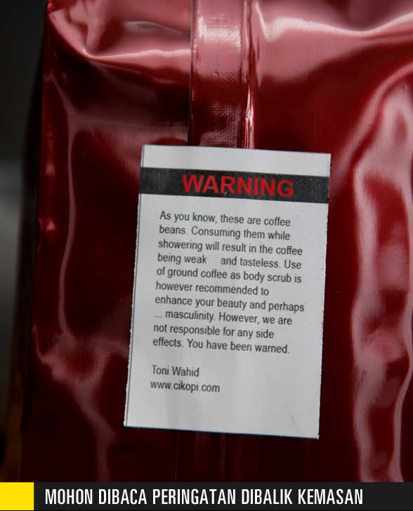 Mirza Luqman, a Q Grader, had evaluated this coffee and she also gave me a note on its flavour, which I then translated into what is being written on the front of the packaging. I hope you can understand my rather unsual ways with words, including the warning label on the back, which is far from the usual coffee warning labels that you come across from.