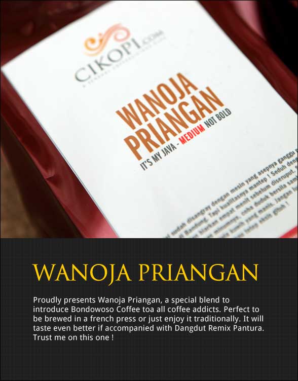 You may wonder though; If it’s from East Java, then why is it called “Wanoja Priangan”, which sounds very Sundanese? When this project was discussed, I asked Yusri to name it with the inspiration from a traditionally-known Javanese icon. Instead, he gave the entire decision to me, and he asked that it was to be given a catchy name that had marketing gimmick aspects, and of course, sounded very chic. So Wanoja Priangan was chosen, without eliminating the origin of the coffee itself, which is mentioned on its packaging, complete with contact information for those who are interested to directly get in touch with owner of the plantation himself.