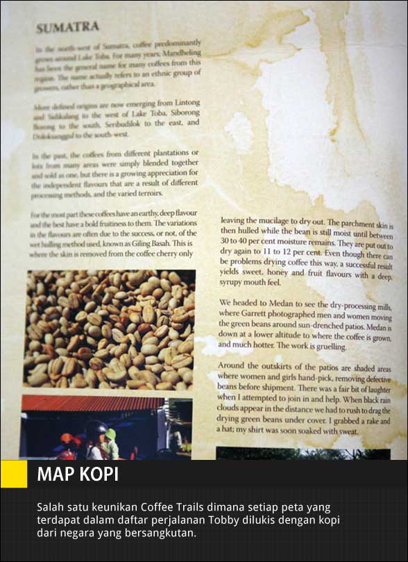 Dari daftar isi Toby menyusun bukunya dengan perjalanan yang dimulai dari Ethiopia, lalu Yaman, India, Jamaica, Brazil, Kenya, Indonesia, dan negara-negara lainnya di Amerika. Sebagaimana sebuah buku perjalanan yang banyak dihiasi oleh foto-foto memukau, demikian juga Coffee Trails yang dengan apik didokumentasikan oleh rekannya Mathew Evans.