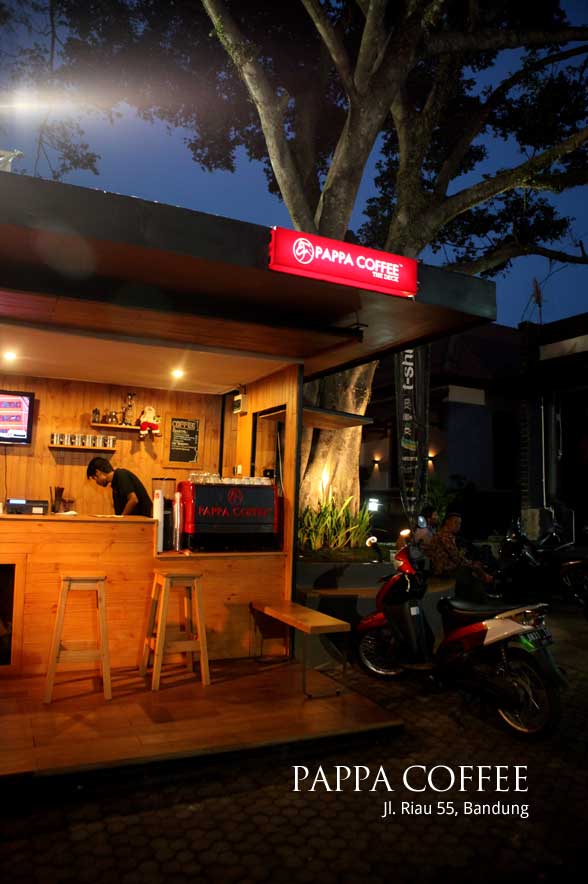 Pappa Coffee boleh saja berukuran kedai kopi kecil yang hanya sepenggal kotak berukuran 5×4 meter yang bar-nya terbuat dari kayu yang dipoles vernis mengkilat, gaya dapur Eropa Utara. Tapi keberadaanya di jalan Riau no.55 55 persis di depan RS Halmahera yang baru berumur tiga minggu bukan hanya mulai dikenali komunitas kopi, tapi juga pelancong di kota seribu factory outlet ini.