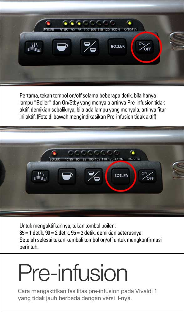 Mohon koreksi bila salah, Progressive pre-infusion sebuah alat seperti tabung harus dipasang terlebih dahulu agar Vivaldi bisa melakukan tugasnya untuk para Barista yang ingin mengekplorasi fasilitas iniSetelah ditelaah kembali, saya harus meralat karena Vivaldi 1 sudah menyertakan fasilitas pre-infusion tanpa harus memasang chamber khusus. Lihat detail cara lengkap mengaktifkan fitur ini pada posting saya di : http://www.cikopi.com/2010/09/vivaldi-ii-pre-infusion/.