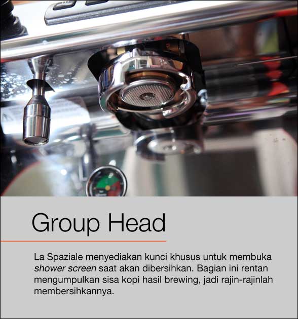 Satu hal yang saya sukai pada Vivaldi adalah kemudahan dalam membersihkan group head karena tinggal memutar satu baut di bawah shower screen. Kunci untuk membuka shower screen sudah disediakan dan diharapkan untuk digunakan dalam rangka perawatan rutin pada bagian ini.