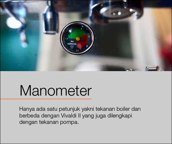 - Manometer hanya menunjukan angka tekanan boiler, sedangkan Vivaldi II juga dilengkapi dengan tekanan pompa.